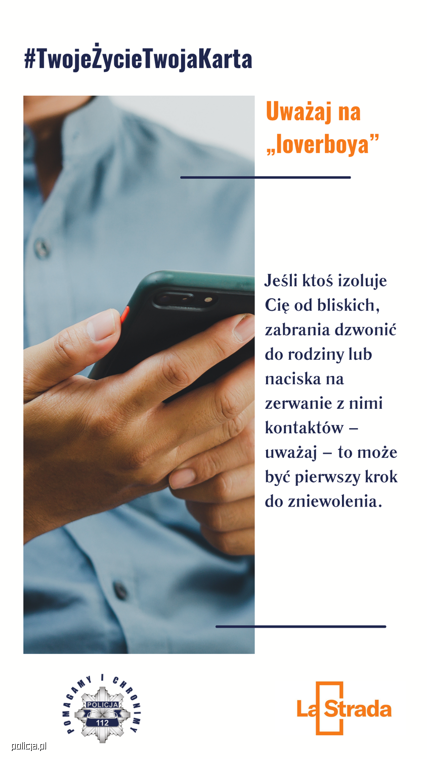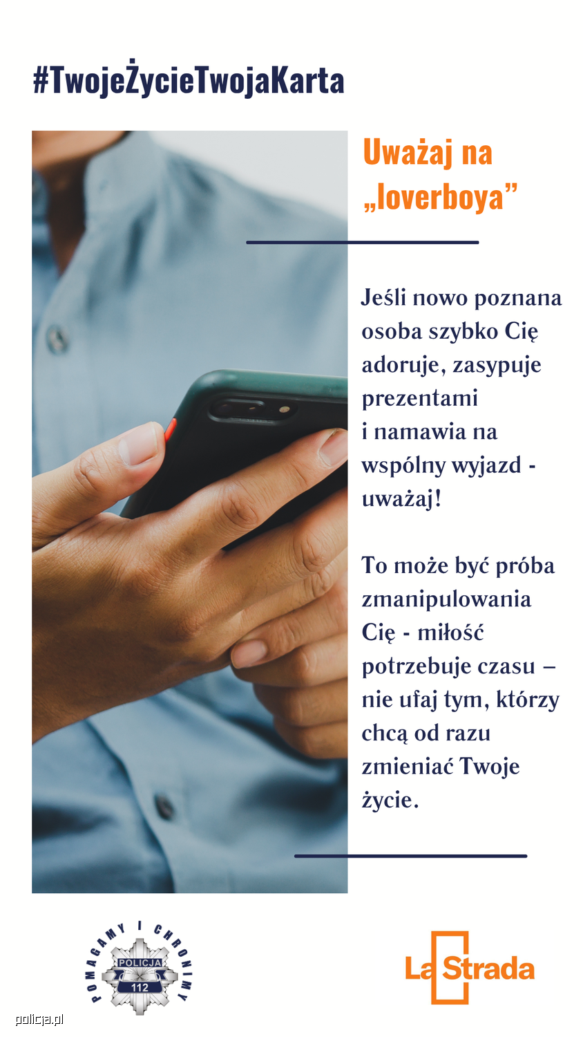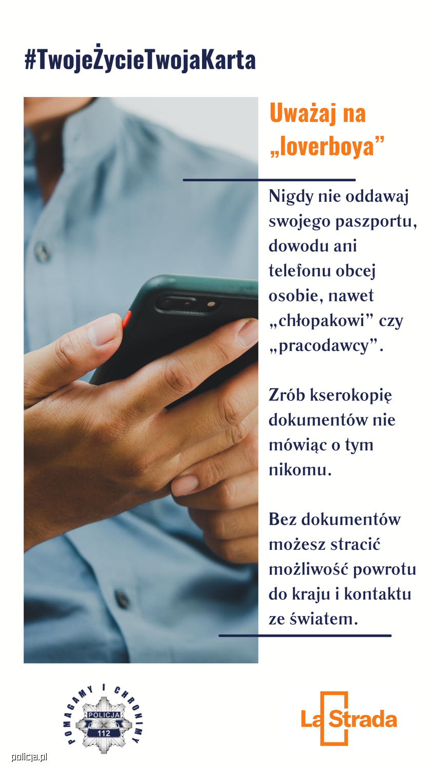 Kampania #TwojeŻycieTwojaKarta powstała z inicjatywy Policji i Fundacji La Strada, by przeciwdziałać handlowi ludźmi. Jej celem jest edukacja, ostrzeganie i budowanie świadomości. Ofiarą może być każdy – bez względu na wiek, pochodzenie czy miejsce zamieszkania.