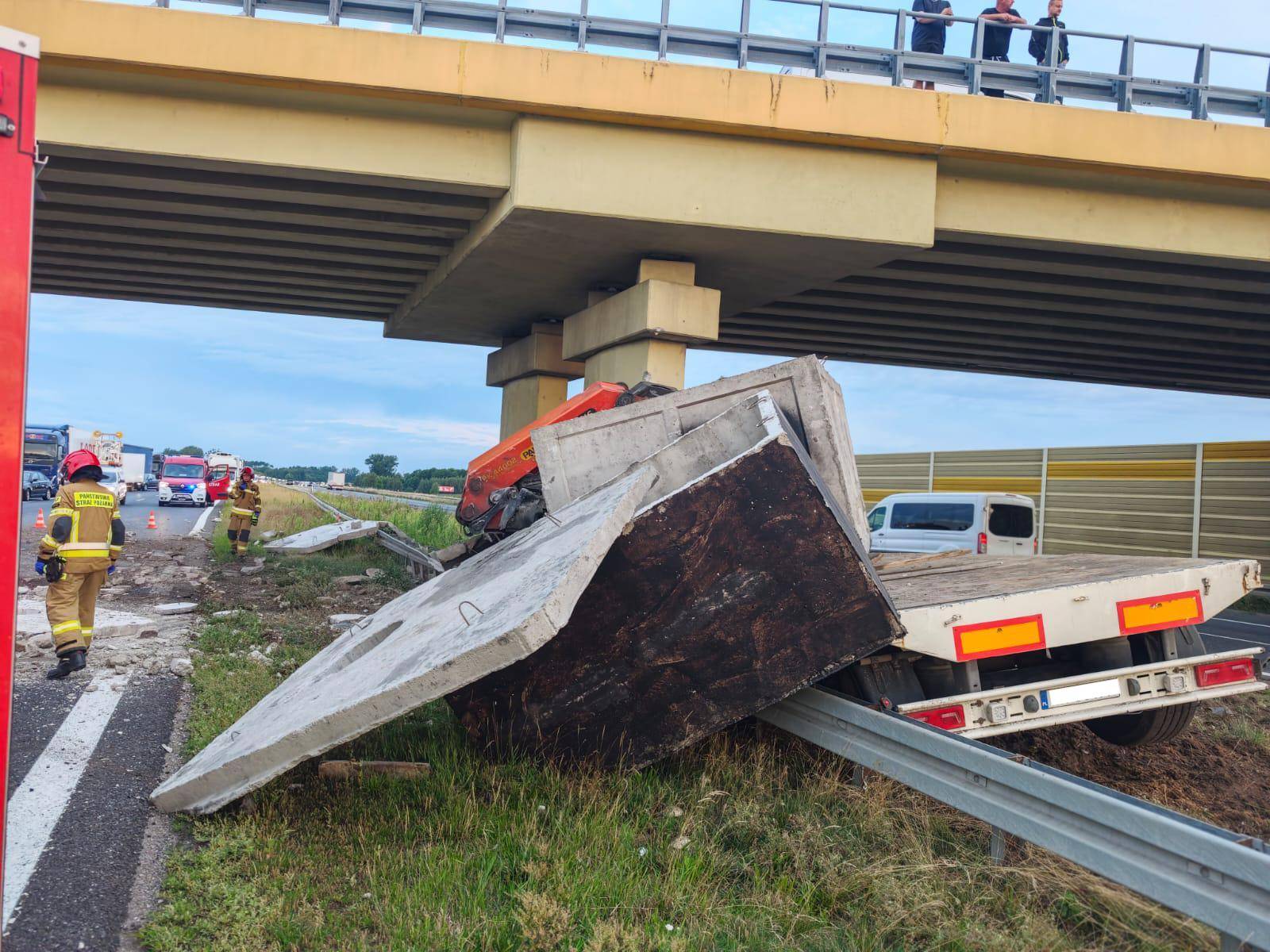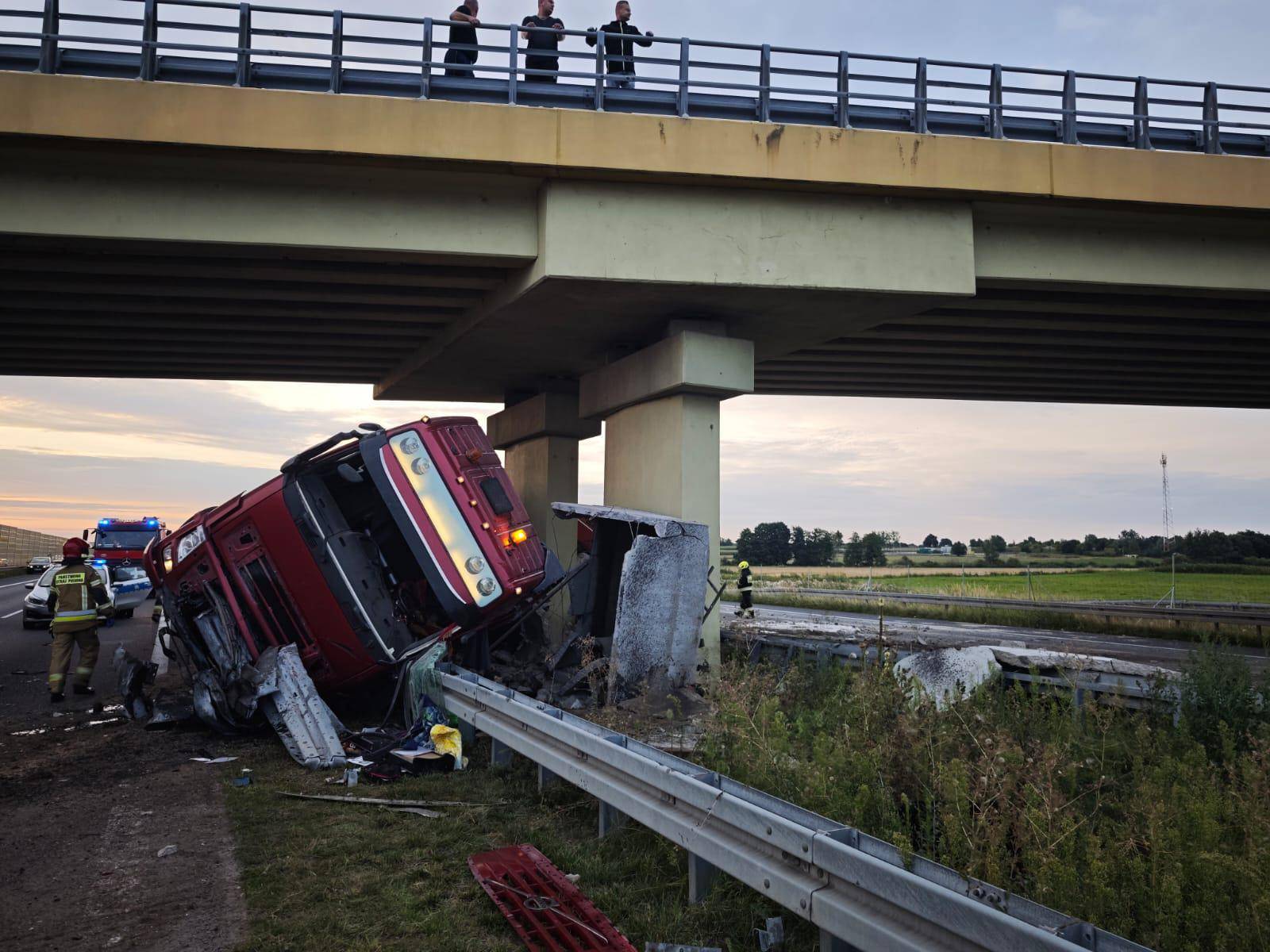 Poważny wypadek na A2. Ciężarówka uderzyła w wiadukt – ładunek rozsypał się na autostradzie