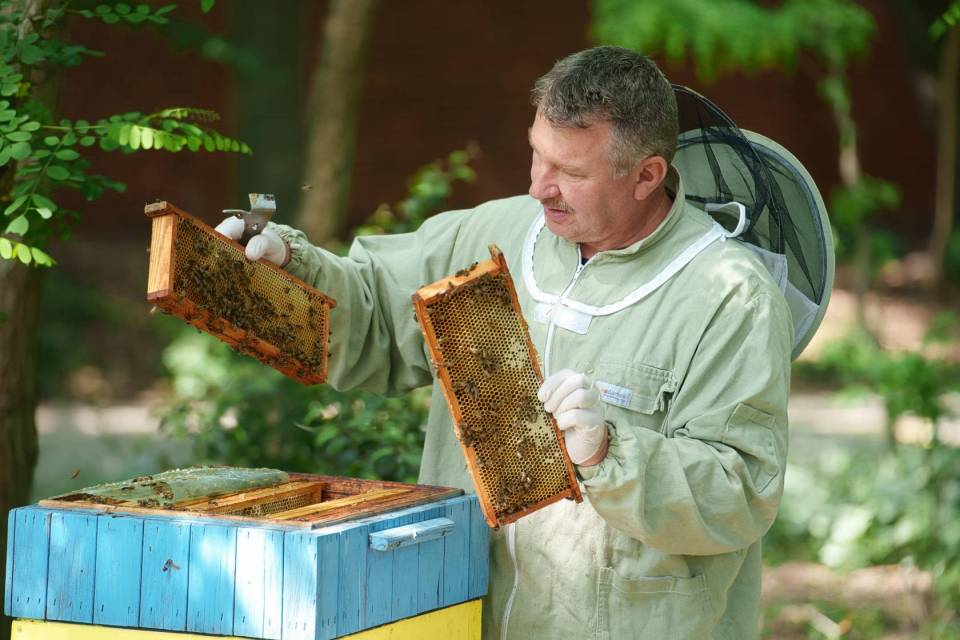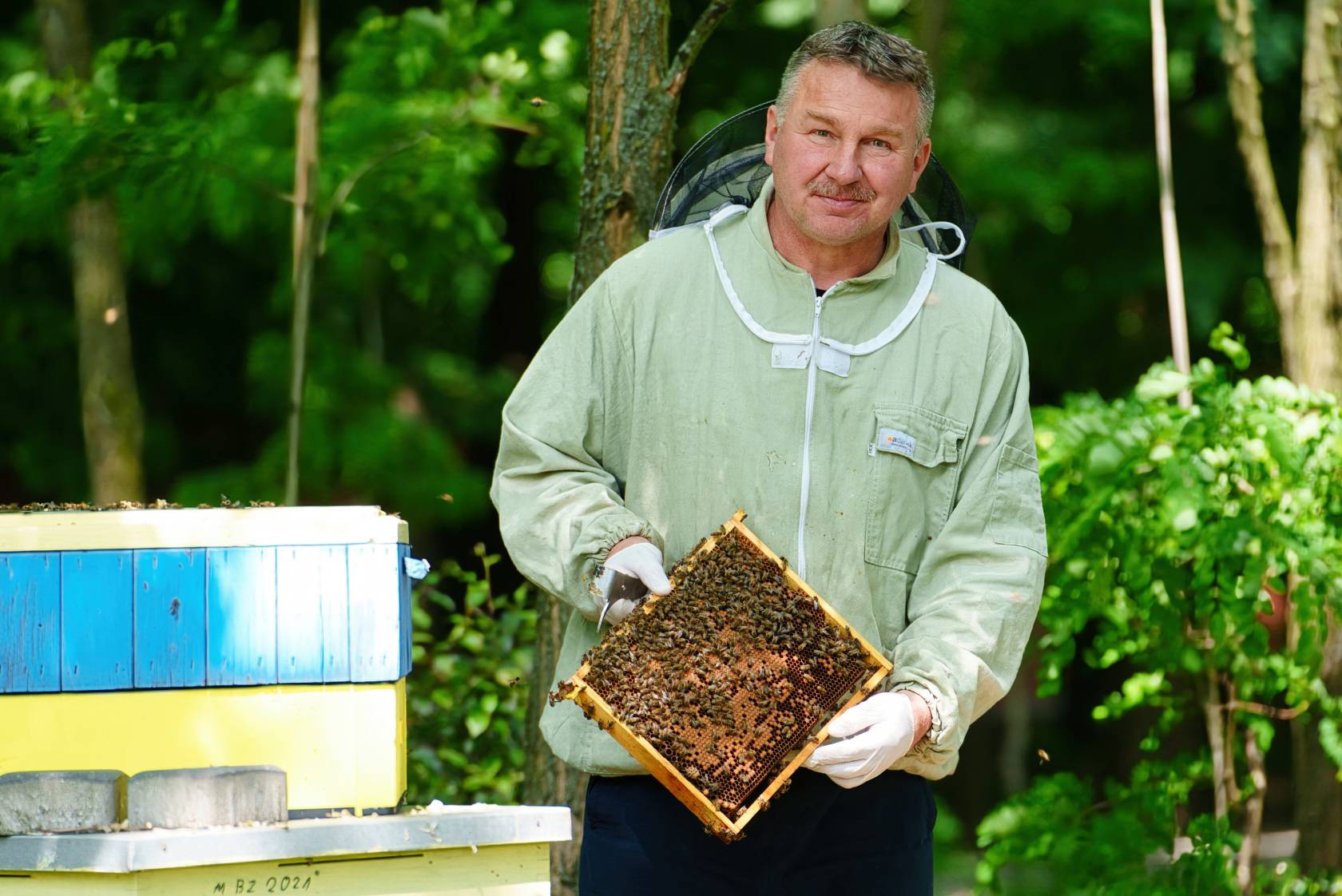 – Pszczoły to taka działalność po godzinach, w międzyczasie – żartuje, ale pszczoły traktuje bardzo poważnie. W ocenie lekarza weterynarii, pasieka Na Wzniesieniach Łódzkich jest jedną z lepiej utrzymanych. Pan Piotr bardzo dba o swoje rodziny, regularnie objeżdża ule i… rozmawia z pszczołami. – Tak, rozmawiam z psiulkami, cały czas, a najczęściej jak mnie żądlą – przyznaje ze śmiechem.